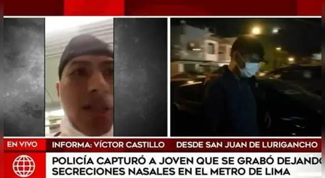 Lo atraparon. Luego de un exhausto trabajo de búsqueda, la Policía Nacional del Perú logró ubicar y capturar al sujeto, identificado como Daniel Livimoro Yepez, que se hizo tendencia en las redes sociales por grabar un video en el que se le ve dejando sus secreciones nasales en las barandas de los trenes del Metro de Lima, aún cuando esto representa un gran peligro debido a la crisis que vivimos por el coronavirus.