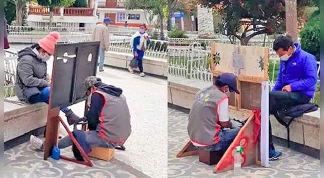El autor de esta increíble postal corresponde a Wilder Hernández, quien acudió a la Plaza de Armas de Bambamarca y retrató a unos lustrabotes quienes estaban empleando un escudo de madera para así evitar ser contagiados.