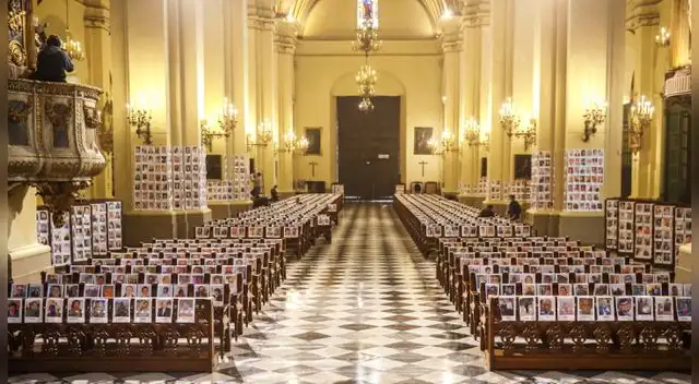 Más de 5000fotografías de peruanos fallecidos por el coronavirusfueron ubicadas en asientos de la Catedral de Lima.