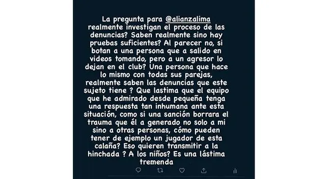 Desde su cuenta de Instagram, Andrea Barrastes escribió. "La pregunta para Alianza Lima, ¿realmente investigan el proceso de las denuncias? ¿Saben realmente si no hay pruebas suficientes? Al parecer no. Si botan a una persona que salió en videos tomando, pero a un agresor lo dejan en el club. Una persona que hace lo mismo con todas sus parejas. ¿Realmente saben las denuncias que este sujeto tiene? Qué lastima que el equipo que he admirado desde pequeña tenga una respuesta tan inhumana ante esta situación", publicó.