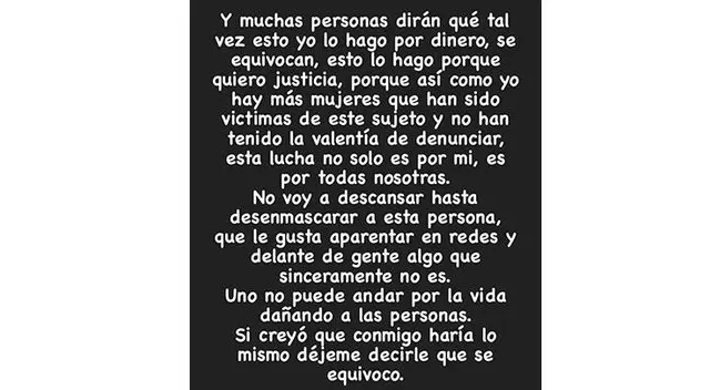 Luego, Andrea Barrantes agrega. "Y muchas personas dirán que tal vez esto yo lo hago por dinero, se equivocan. Esto lo hago porque quiero justicia, porque así como yo hay más mujeres que han sido victimas de este sujeto y no han tenido la valentía de denunciar", precisa en dos historias de Instagram.