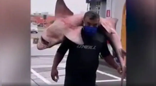 El video, publicado por la pagina Tu pasión, muestra cómo este señor caminaba cerca a un grifo ubicado en la avenida El Ejército del distrito limeño de Miraflores con un tiburón que parecía ser su trofeo.