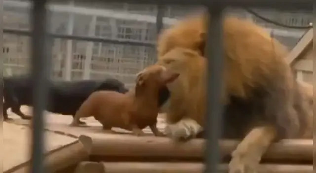 Un clip viral en Facebook demuestra que los perros también pueden ser amigos de los leones. Según se puede apreciar en un video registrado con un celular, dos perros salchicha ingresaron al hábitat de un león.