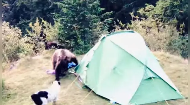 Dos osos salvajes hicieron correr a un par de turistas y abandonaron su carpa. Ante ello, un perro tuvo que salir en defensa de los humanos y enfrentarse a los enormes mamíferos. Todo esto quedó registrado por uno de los testigos.