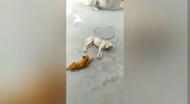 Un perro, quien hacía eco a lo anteriormente dicho, dormía sin importarle nada y cuando despertó se dio con la gran sorpresa de que a su lado estaba un tigre de peluche, el cual no estaba cuando decidió echarse una siesta.