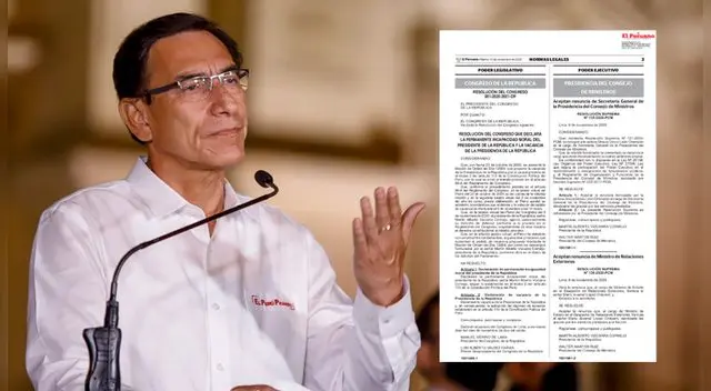 Esta mañana, el diario oficial El Peruano, publicó la Resolución del Congreso 001-2020-2021-CR, que declara a Martín Vizcarra con "permanente incapacidad moral", y por consiguiente, hace efectiva la vacancia que se aprobó con 105 votos el día de ayer en el hemiciclo.