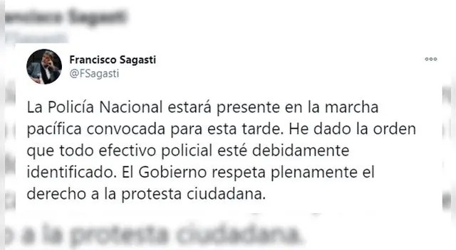 "La Policía Nacional estará presente en la marcha pacífica convocada para esta tarde. He dado la orden que todo efectivo policial esté debidamente identificado. El Gobierno respeta plenamente el derecho a la protesta ciudadana", señaló el jefe de Estado mediante su cuenta de Twitter.