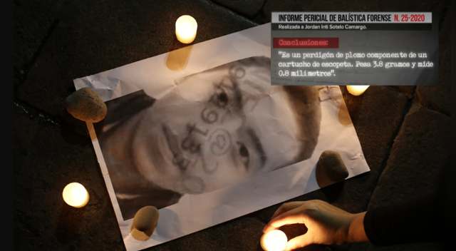 "Jordan Inti Sotelo Camargo presentó una herida de curso penetrante con entrada en la región pectoral izquierda. Con trayectoria de adelante hacia atrás, de arriba hacia abajo. Ligeramente de izquierda a derecha. No hay características de que el disparo fuera efectuado a corta distancia (siendo la corta distancia menor a 1.50 metros)", sostiene la pericia balística.