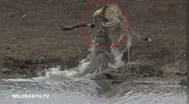 En cuestión de unos segundos el reptil salió del agua para morder directamente al cuello del guepardo, que nada pudo hacer para evitar ser la presa en esta ocasión. Al estar prácticamente derrotado, el felino sin fuerza alguna se dejó arrastrar al agua.