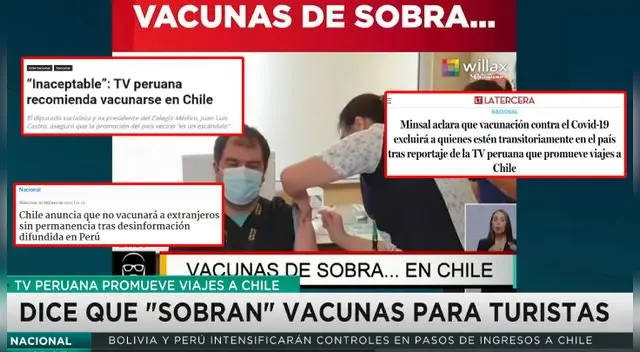 Un reportaje difundido en Willax Televisión invitaba a realizar 'turismo médico' en Chile para poder vacunarse totalmente gratis. El informe periodístico señaló que en el país vecino "sobran las vacunas".