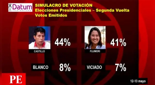 Según el primer simulacro de la encuestadora Datum con miras a la segunda vuelta, Pedro Castillo lidera la intención de voto con un 44%, mientras que Keiko Fujimori cuenta con un 41%, teniendo una diferencia mínima de tres puntos. Además, también se aprecia que un 8% mantendría su voto en blanco y un 7% tendría un voto viciado.