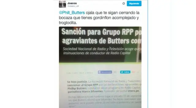 Resulta que el tuitero con la cuenta @Joaco_Ldr se burló de la sanción que le impuso la Sociedad Nacional de Radio y Televisión (SNRTV) al medio RPP debido a que Butters llamó “mermelero” al periodista Marco Sifuentes.
