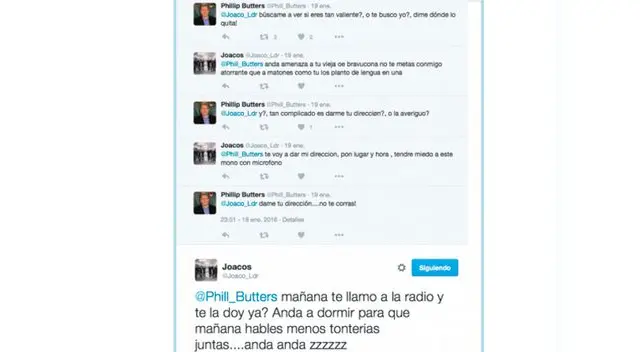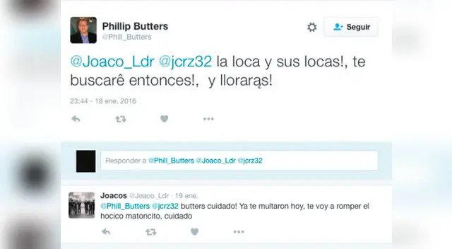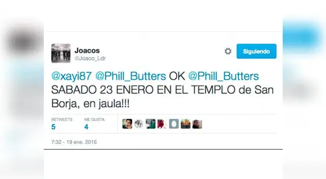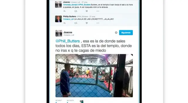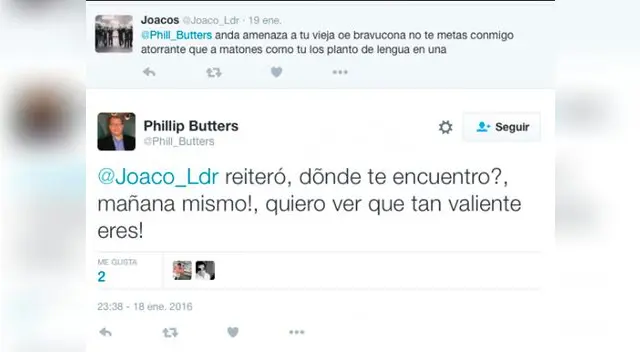 Tras ello, Butters no aguntó la burla por lo que retó a @Joaco_Ldr para una pelea. Le pidió fecha, lugar y hora para que se lleva a cabo el duelo. El tuitero aceptó y le dio estos requisitos al periodista que al final, al darse cuenta a quien iba a enfrentar, terminó por no ir a la lucha.