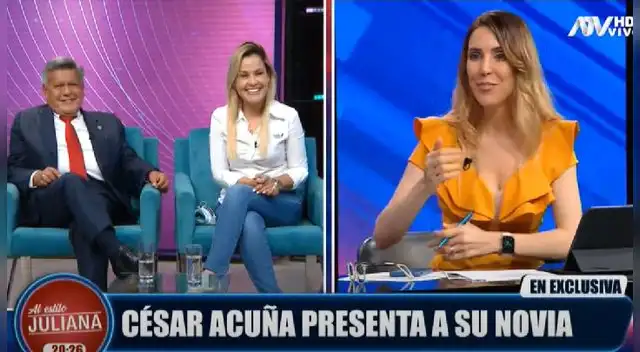 La noche de ayer, Juliana Oxenford recibió en su set de televisión al candidato presidencial de Alianza para el progreso, César Acuña. Dando la sorpresa, el aspirante al sillón presidencial no llegó solo, pues su novia, Gisell Prado, lo acompañó hasta el set de ATV.