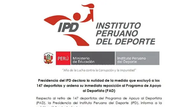 Presidencia del IPD declara la nulidad de la medida que excluyó a los 147 deportistas y ordena su inmediata reposición al Programa de Apoyo al Deportista (PAD).