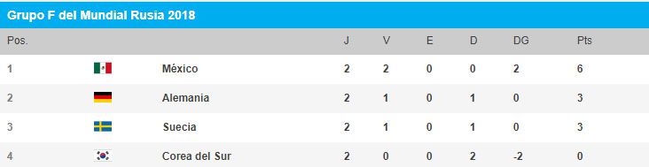 El Grupo F del Mundial Rusia 2018 está de candela y tiene a México, Alemania, Suecia y Corea del Sur en la pelea por los dos cupos para octavos de final. Conoce a continuación cómo quedó la tabla de posiciones tras la fecha 2