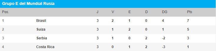 El grupo E del Mundial Rusia 2018 se define este jueves y Brasil, Suiza y Serbia pelean por obtener los dos boletos para los octavos de final. Conoce cómo marcha EN VIVO la tabla de posiciones.